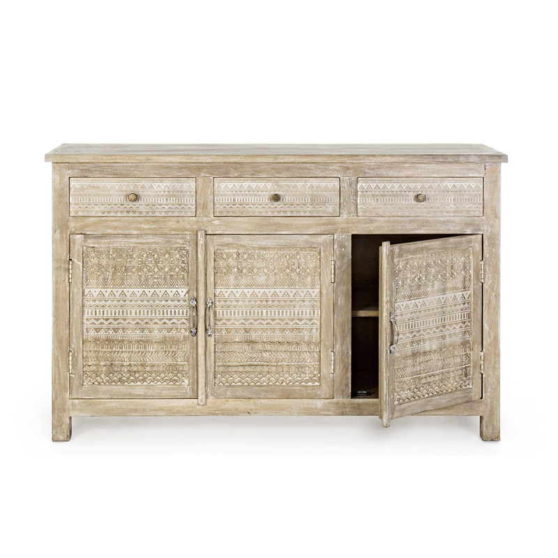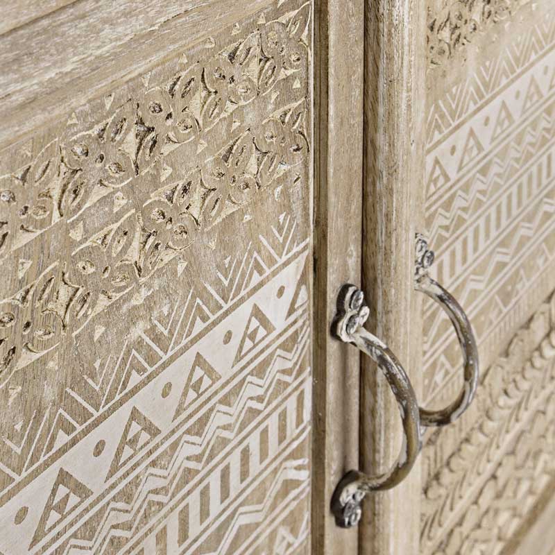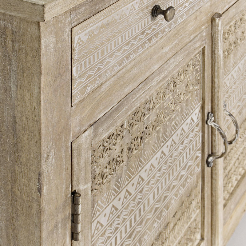 This intriguing carved Timorese sideboard will make a beautiful addition to your home. Made of teak with incredible relief carved decoration on all surfaces, it has wonderful small proportions which makes it a great fit for smaller spaces. Two doors over two shelves gives your room a bit of extra storage.